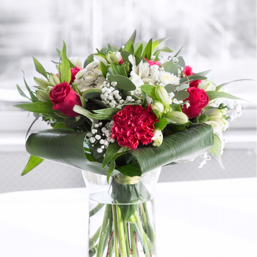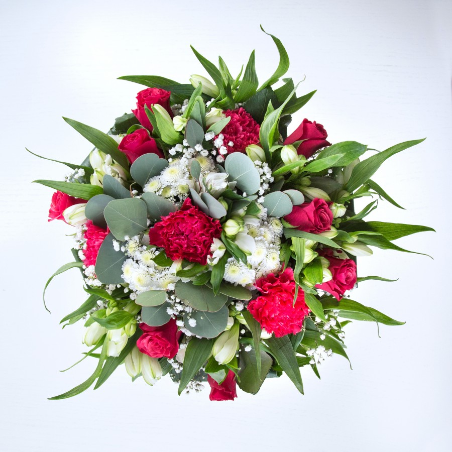 Immerse yourself in the beauty and uniqueness of our Exquisite Elegance Bouquet. This stunning arrangement features vibrant red roses and delicate white chrysanthemums, harmoniously blended with soft gypsophila and charming carnations.